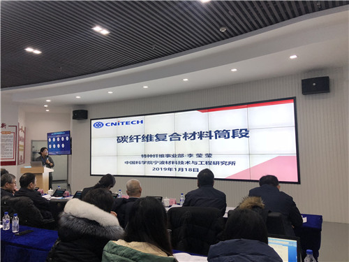 宁波材料所特种纤维事业部李莹莹、金璐、罗文圣三人代表团队参加了此次决赛,参赛作品《碳纤维复合材料筒段》是以宁波材料所国产M50J级高强高模碳纤维为材料基础,以预浸成型加工工艺为创新点,通过热压罐工艺制备性能优异国产高强高模碳纤维复合材料筒段,从而实现大幅减重、增强的效果。决赛现场,团队成员对参赛作品进行了详细的介绍与答辩,项目方案得到专家评委的肯定与好评。