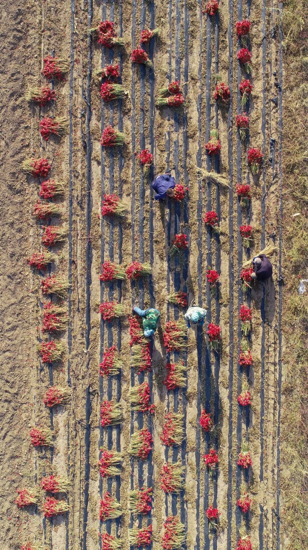 ▲图为2019年10月9日,辽宁省法库县秀水河子镇长岗子村村民在田间捆扎辣椒。图片来源:视觉中国