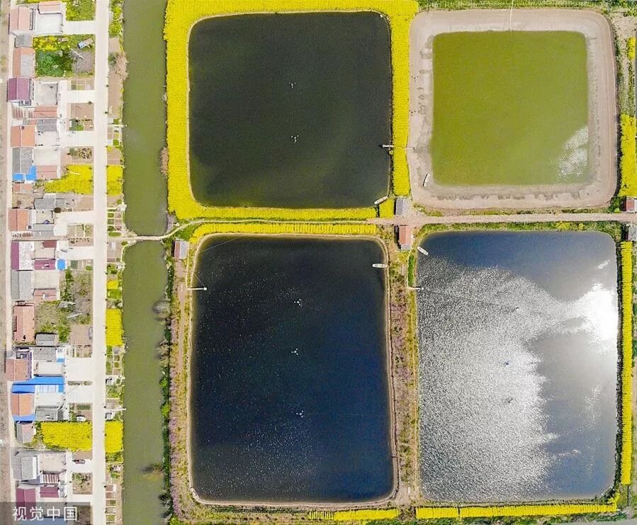▲图为江苏淮安金湖县高邮湖村,鱼塘周边的田埂上油菜花开。图片来源:视觉中国