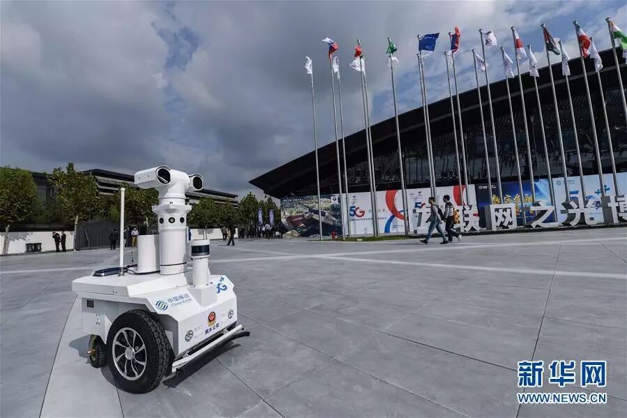 这是互联网之光博览会场馆外巡逻的5G警用机器人(10月18日摄)。 新华社记者 徐昱 摄