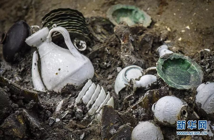 南宋古沉船“南海一号”是保存在“海上丝绸之路”主航道上的珍贵文化遗存。图为沉船右侧中部船舱位置,散落着一摞摞福建德化窑白瓷器和福建磁灶窑绿釉器。