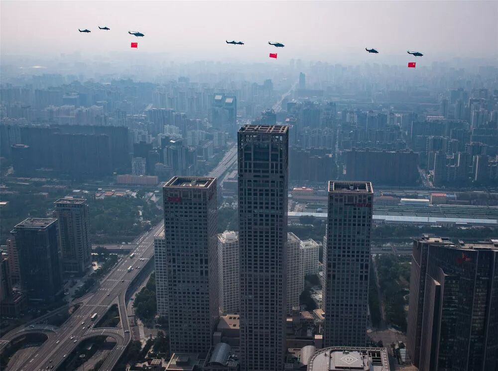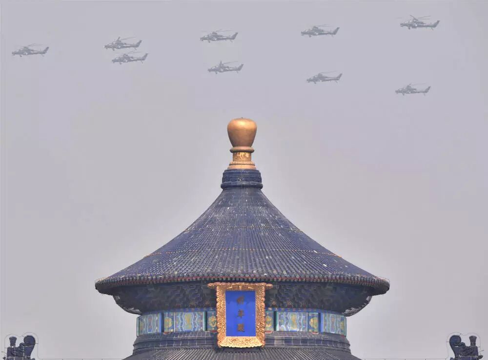 2019年10月1日,庆祝中华人民共和国成立70周年大会在北京天安门广场隆重举行。这是从天坛公园拍摄的陆航突击梯队。新华社记者贺长山摄