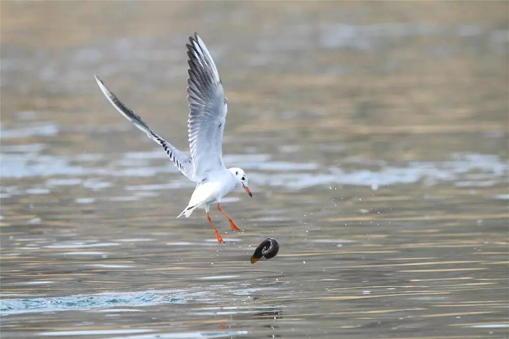 2019年3月17日,水鸟在山西省太原市汾河湿地公园觅食。新华社记者杨晨光摄