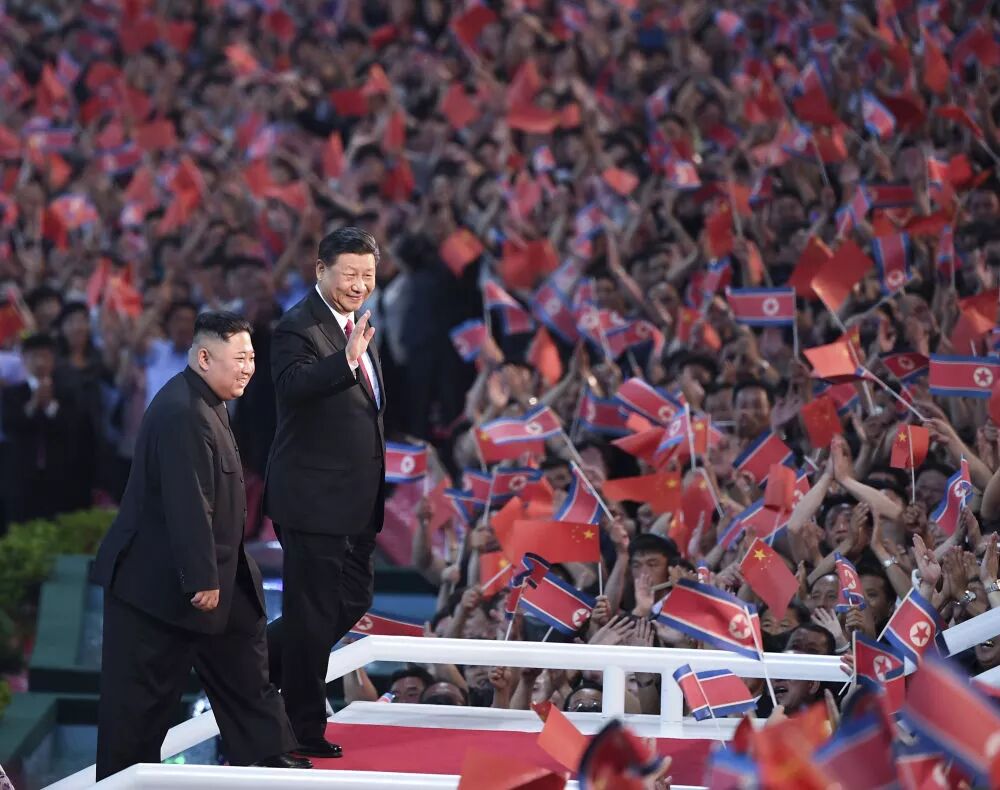 2019年6月20日晚,中共中央总书记、国家主席习近平和夫人彭丽媛在朝鲜劳动党委员长、国务委员会委员长金正恩和夫人李雪主陪同下,在平壤“五一”体育场同朝鲜各界群众一道观看大型团体操和艺术演出。新华社记者燕雁摄