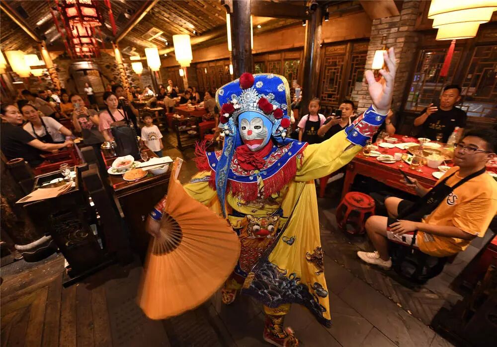 2019年8月4日,食客在四川省成都市宽窄巷子景区内的一家火锅店观看“变脸”表演。新华社记者刘坤摄