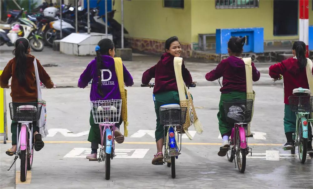 2019年3月8日,在云南省瑞丽市姐相乡银井村,银井小学几名缅籍学生骑车回家,跨过银井边防口岸国境线。每天清晨,都有一群孩子通过银井边防站,从缅甸来到瑞丽市银井小学读书。新华社记者李晓果摄