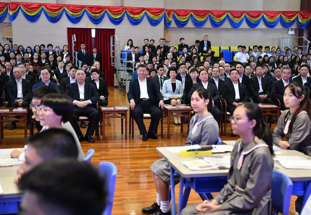2019年12月19日,国家主席习近平在澳门特别行政区行政长官崔世安陪同下,来到位于澳门黑沙环的政府综合服务中心和濠江中学附属英才学校,同澳门市民和师生亲切交流。这是习近平在濠江中学附属英才学校观摩以“‘一国两制’与澳门”为题的中国历史公开课。新华社记者李涛摄