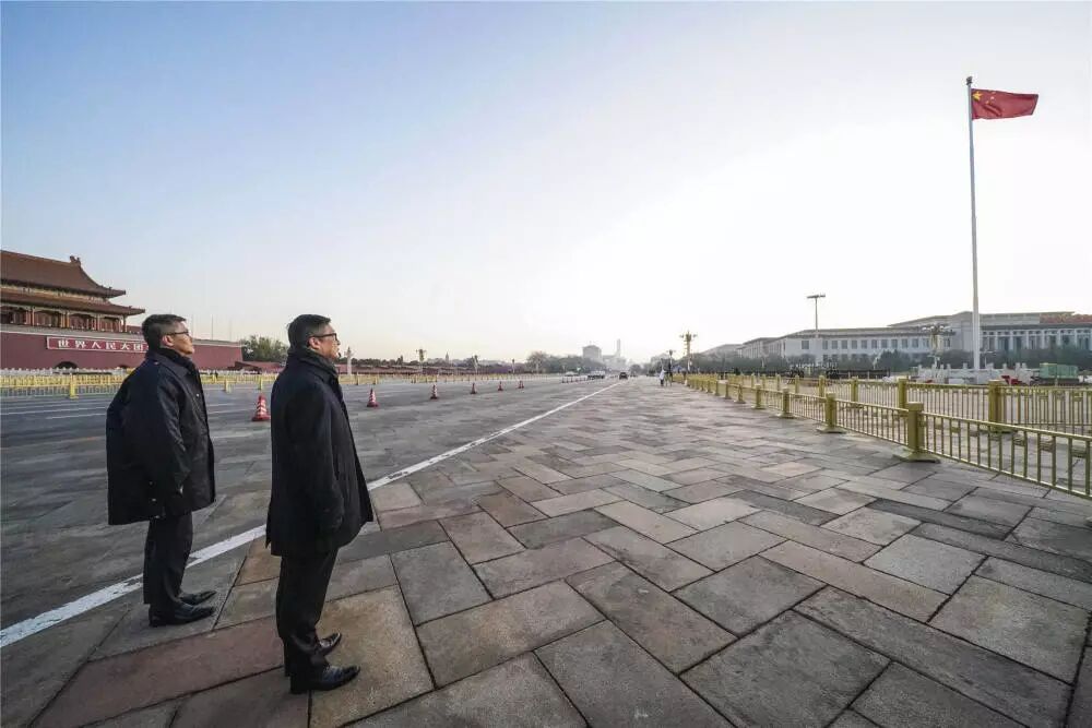 2019年12月7日,新任香港特区政府警务处处长邓炳强(右)率香港警务处代表团来到北京天安门广场,观看升国旗仪式。新华社记者殷刚摄