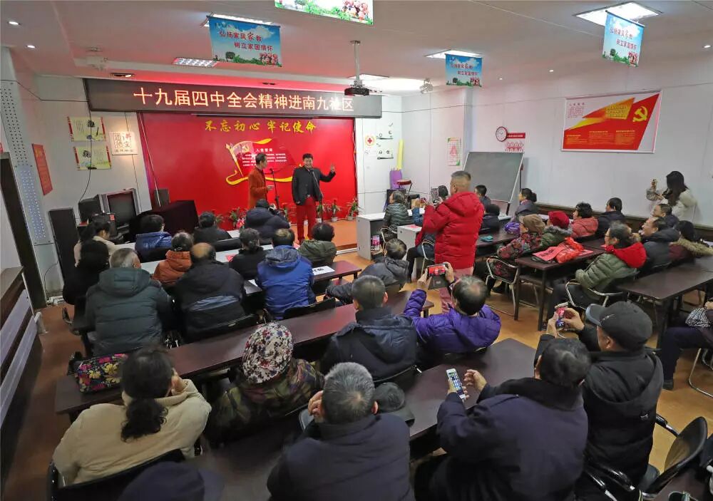 2019年11月26日,辽宁省十九届四中全会精神曲艺宣讲小分队成员在沈阳市南九社区活动室表演节目《大和小》。新华社记者杨青摄