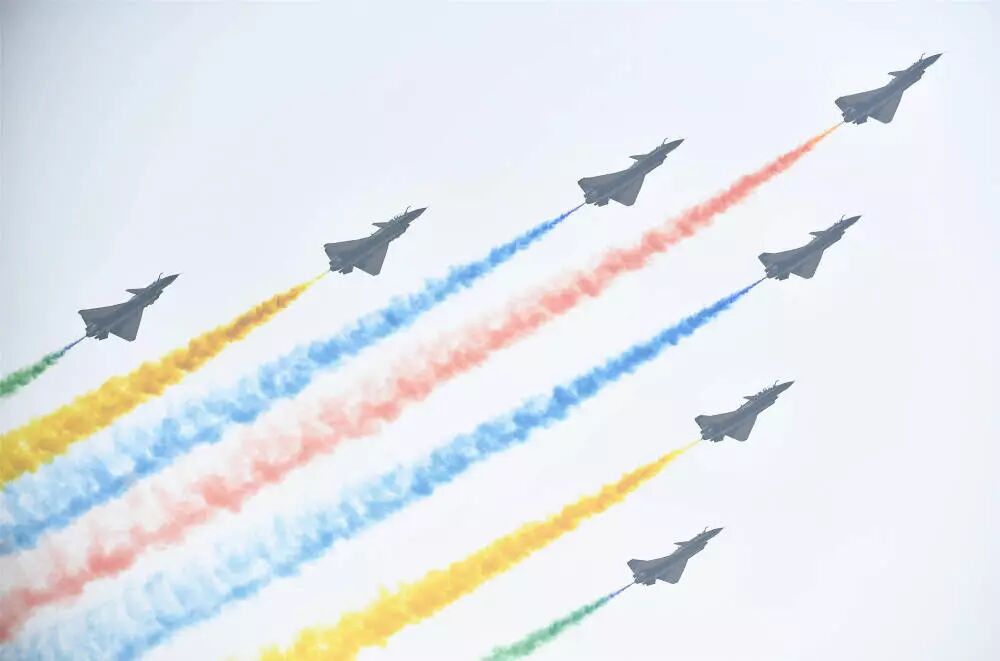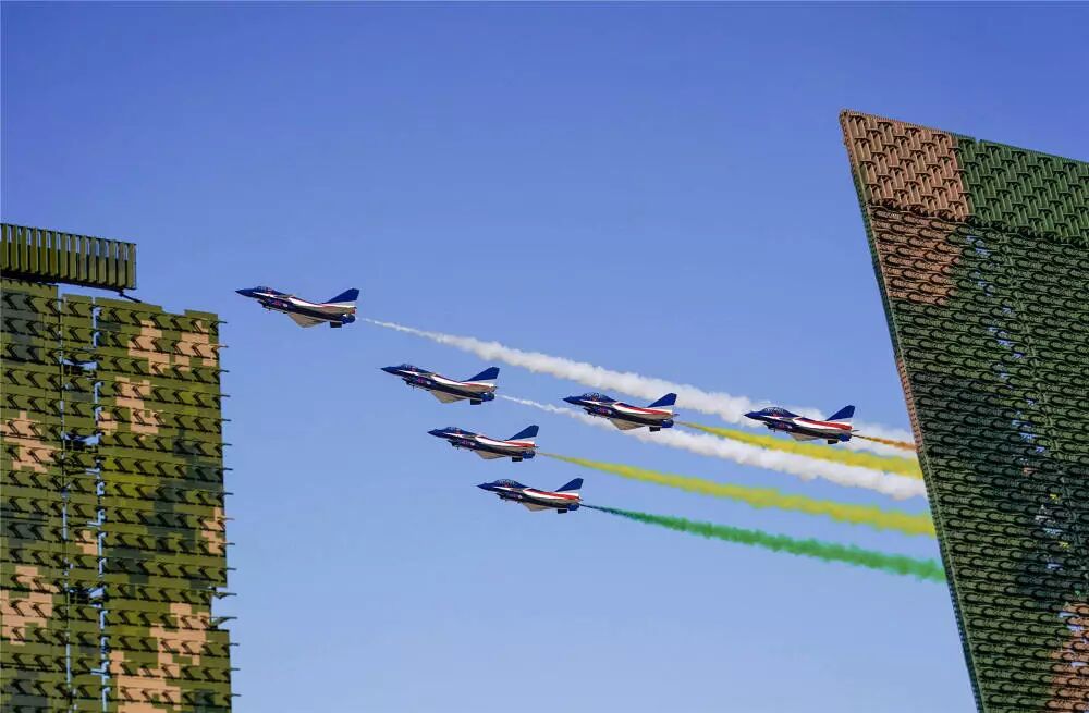 2019年10月21日,在吉林长春举行的庆祝人民空军成立70周年航空开放活动上,空军八一飞行表演队歼-10飞机编队从静态展示的新型雷达上空飞过。新华社发(万全摄)
