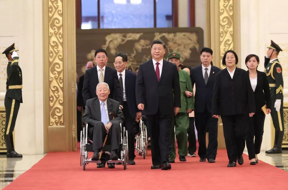 2019年9月29日,中华人民共和国国家勋章和国家荣誉称号颁授仪式在北京人民大会堂金色大厅隆重举行。中共中央总书记、国家主席、中央军委主席习近平同国家勋章和国家荣誉称号获得者一同步入会场。新华社记者丁海涛摄