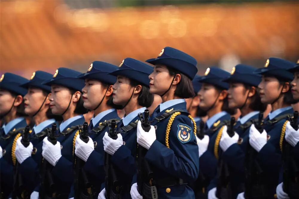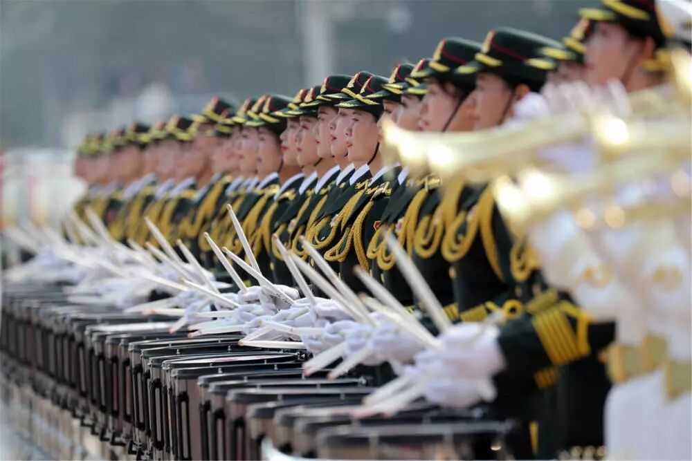 2019年10月1日,庆祝中华人民共和国成立70周年大会在北京天安门广场隆重举行。这是女兵方队接受检阅。新华社记者王毓国摄