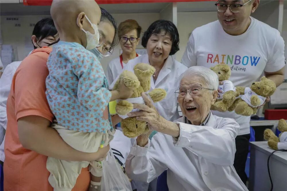 2019年5月31日,北京儿童医院百岁儿科医生张金哲(前右)在北京关爱恶性实体肿瘤患儿公益活动上向住院的孩子赠送儿童节礼物。新华社记者张玉薇摄