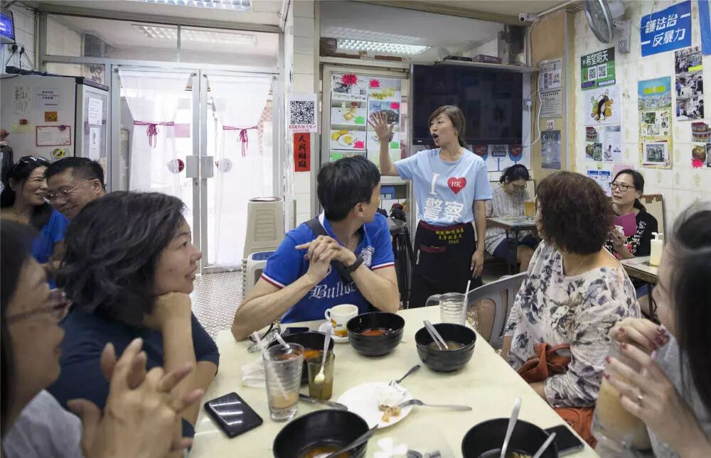 2019年10月10日,食客在李凯瑚位于香港九龙的茶餐厅里聚集,为她加油。51岁的李凯瑚是土生土长的香港人,她多次参加撑警集会,并在社交媒体上表态支持警察。遭到骚扰和恐吓,但李凯瑚继续勇敢支持警察,向市民发出号召,反对暴力。一些香港市民、内地游客专程来到李凯瑚的茶餐厅,为她加油打气,表达对香港的美好祝愿。新华社记者卢烨摄