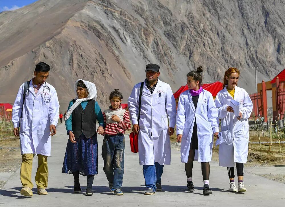 2019年7月7日,新疆塔什库尔干塔吉克自治县达布达尔乡热斯喀木村村医发尔亚特·塔西白克(右三)与来自乡卫生院的医务人员来到热斯喀木村易地扶贫搬迁安置点出诊。从过去骑着马深入大山牧场巡诊,到现在定期前往集中居住点上门服务;从过去几种简单的常备药,到如今种类丰富的各类药品……新疆牧区的医疗条件和水平大幅提升,牧民享受到越来越多、越来越便利的医疗惠民服务。新华社记者胡虎虎摄