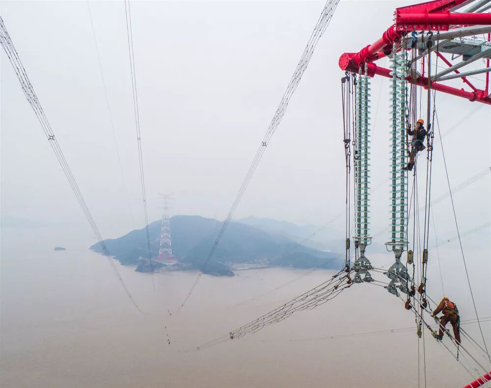 2019年1月3日,施工人员在浙江省舟山500千伏联网输变电工程380米跨海输电铁塔上进行验收和消缺作业(无人机照片)。新华社记者徐昱摄