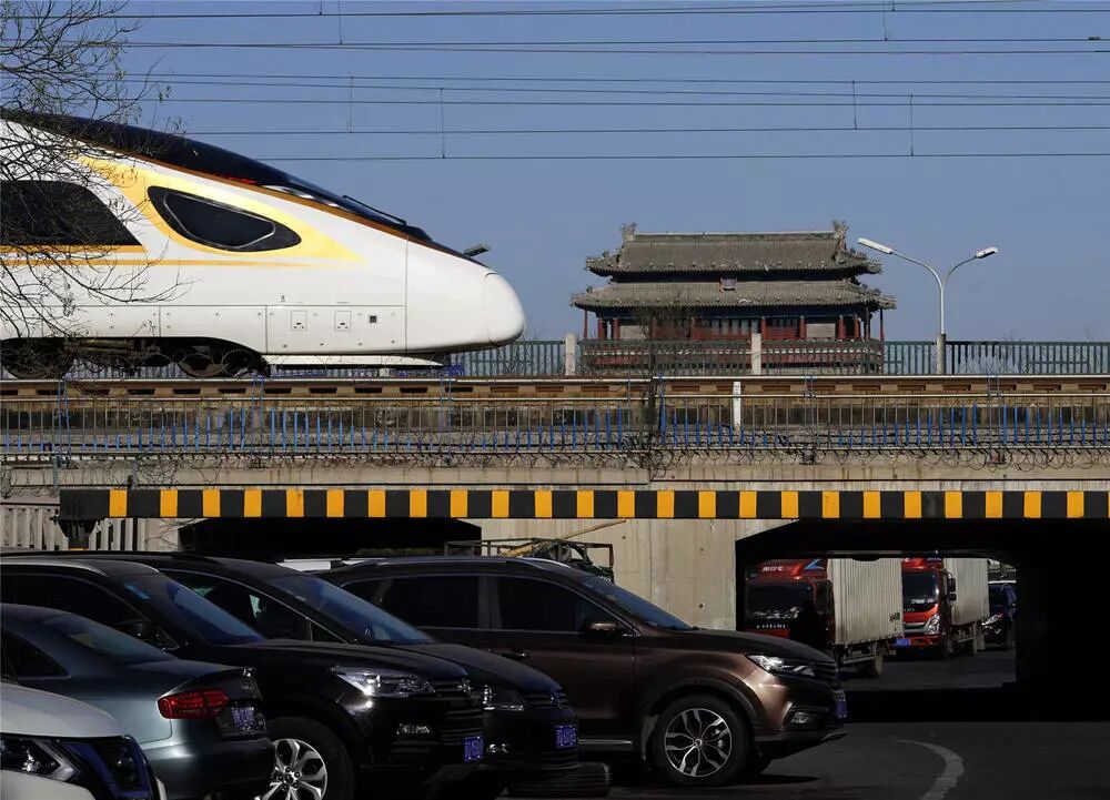 2019年1月25日,一列“复兴号”动车组列车在北京永定门城楼附近的京津城际铁路上行驶。新华社记者邢广利摄