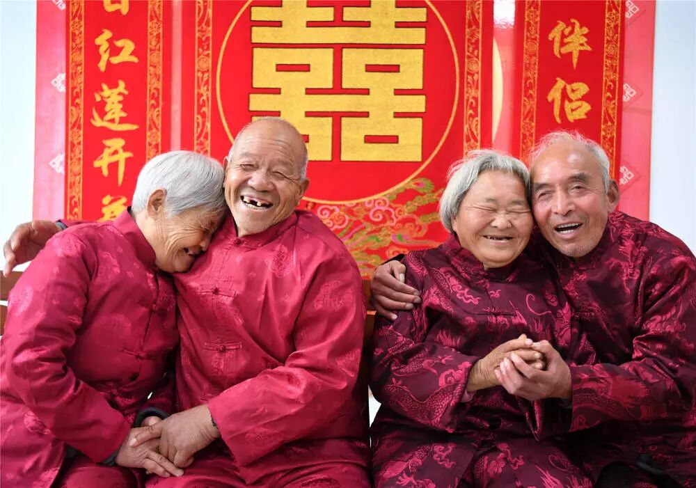 2019年10月15日,张金水、郭当存夫妇(左)和杨红山、除泥莲夫妇(右)在陕西省洛南县灵口敬老院的婚姻登记现场合影留念。他们像年轻人一样,十指紧紧扣在一起,羞涩中带有激动。新华社记者陶明摄