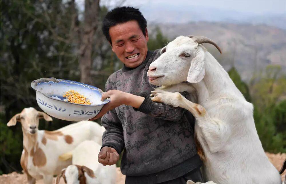 2019年3月27日,在河南省卢氏县沙河乡果角村,村民任当锋在喂羊。41岁的任当锋曾多年在外打工,由于腰部有伤不能干重活。2018年,在知悉卢氏县的金融扶贫政策后,任当锋返乡创业,用贷来的5万元无担保无抵押小额贷款,购买了38只羊,从打工仔变成了一个羊倌。新华社记者李嘉南摄