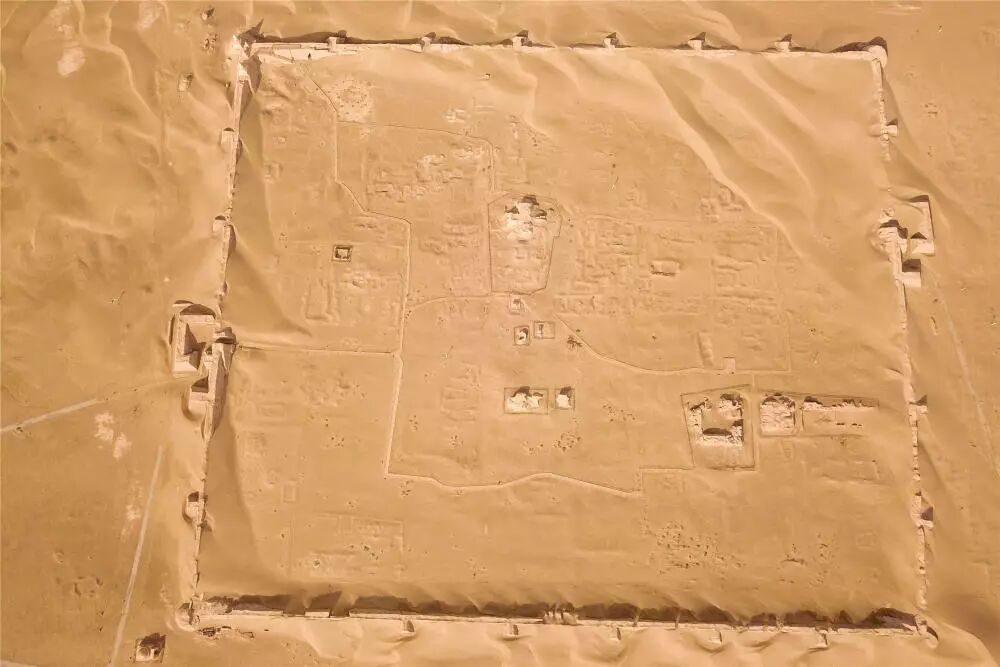 2019年10月18日拍摄的黑城遗址城池全貌(无人机照片)。黑城遗址位于内蒙古阿拉善盟额济纳旗达来库布镇,建于公元九世纪,是草原丝绸之路上现存较为完整的一处古城遗址,2001年被列入第五批全国重点文物保护单位。新华社记者彭源摄