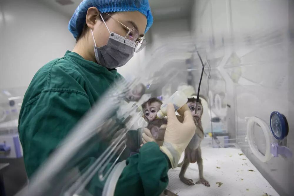2019年1月,我国科学家创建世界首例生物节律紊乱体细胞克隆猴模型。这是1月22日,在位于上海的中科院神经科学研究所非人灵长类研究平台保育室,工作人员在给生物节律紊乱体细胞克隆猴喂食。新华社记者金立旺摄
