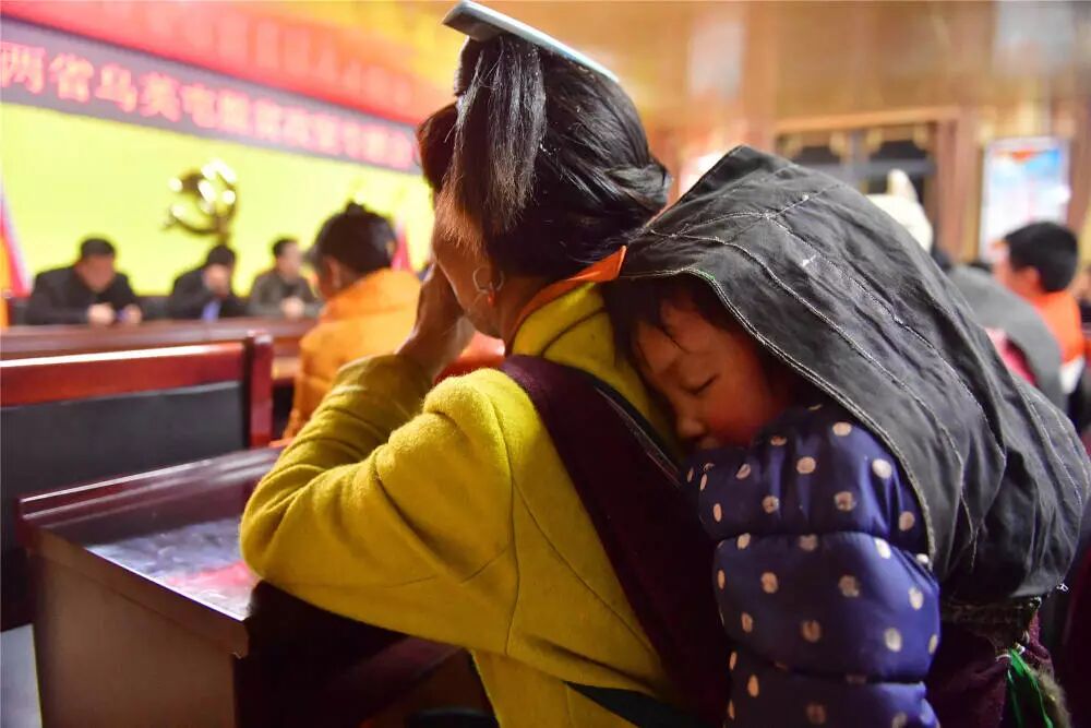 2019年3月14日,一名妇女背着小孩参加乌英苗寨脱贫产业会议。乌英苗寨位于桂黔交界的大苗山深处,共有140户600多人,其中100户属广西柳州市融水苗族自治县杆洞乡党鸠村,40户属贵州省从江县翠里瑶族壮族乡南岑村。这里交通不便,土地资源匮乏,自然环境恶劣,曾经是一个极度贫困的苗寨。2019年,全寨共有44户贫困户实现脱贫,贫困户已从2016年的92户减少到目前的4户。新华社记者黄孝邦摄