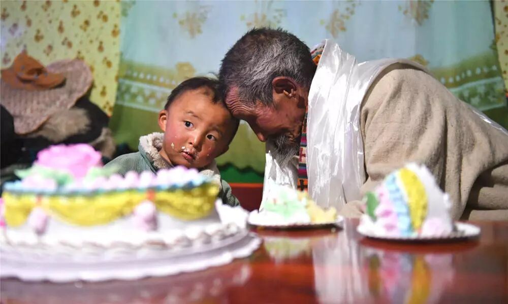 2019年3月20日,西藏拉萨市99岁的巴珠老人在生日聚会上和自己的曾孙碰额头,以示祝福。新华社记者晋美多吉摄