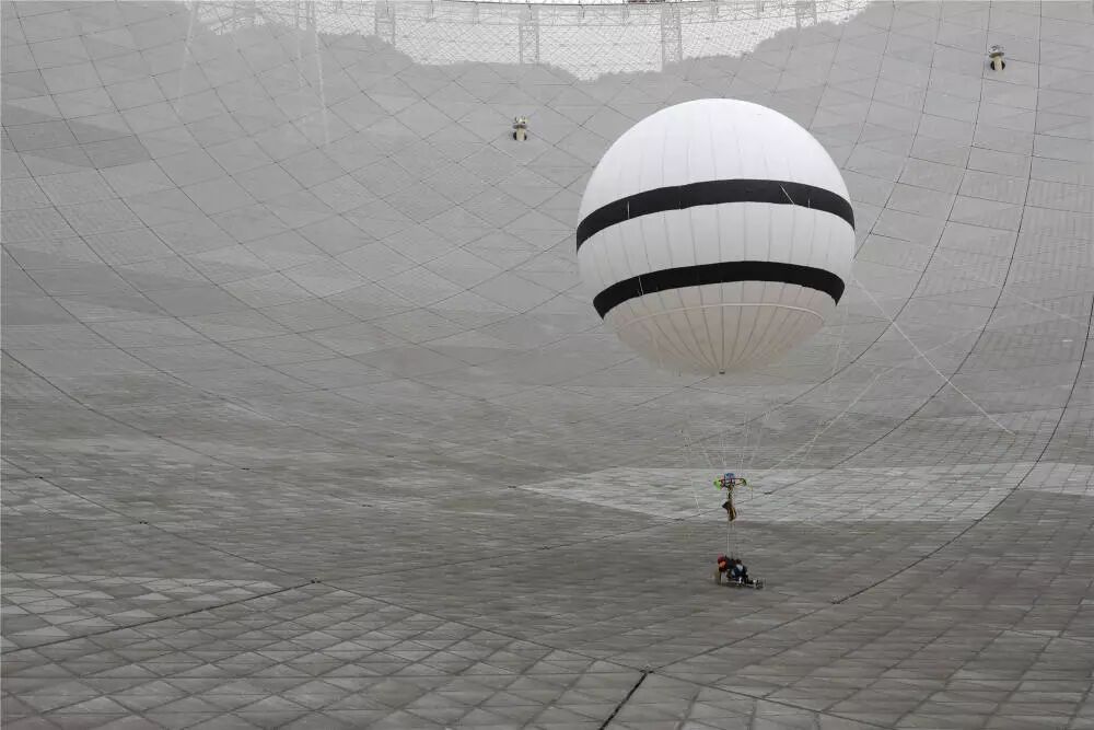 2019年8月30日,在贵州省平塘县,“微重力蜘蛛人”在500米口径球面射电望远镜(FAST)上进行首次巡检实验。FAST调试组于2017年底开始研制“微重力蜘蛛人”,该方案使用一个直径7.6米的氦气球将作业人员体重减少到FAST反射面板能够承受的重量,使作业者能够到达望远镜反射面任意地方执行巡检和维护作业。新华社记者欧东衢摄