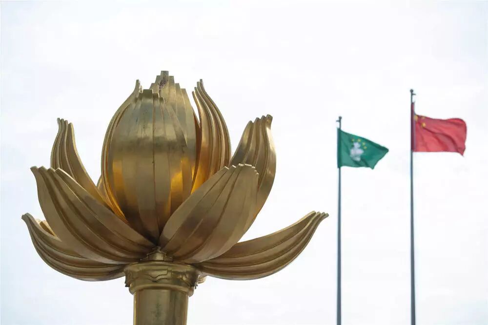 2019年12月13日拍摄的澳门金莲花广场上的“盛世莲花”雕塑。2019年12月20日是澳门回归祖国20周年纪念日。新华社记者张金加摄
