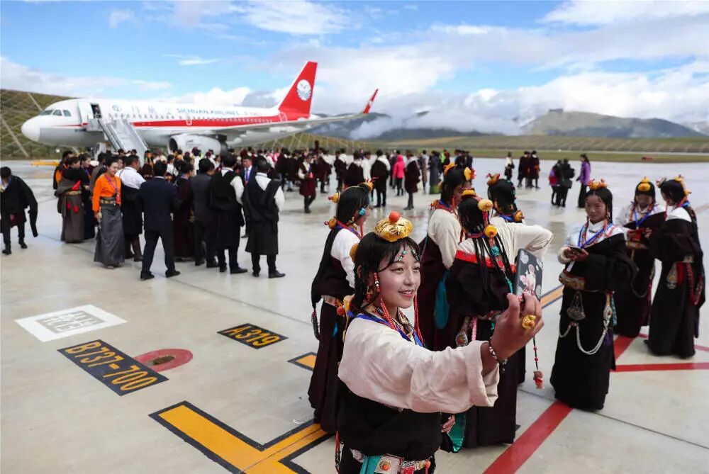2019年9月16日,四川甘孜格萨尔机场正式通航。这是参加甘孜格萨尔机场首航仪式的藏族群众在机场留影。新华社记者江宏景摄