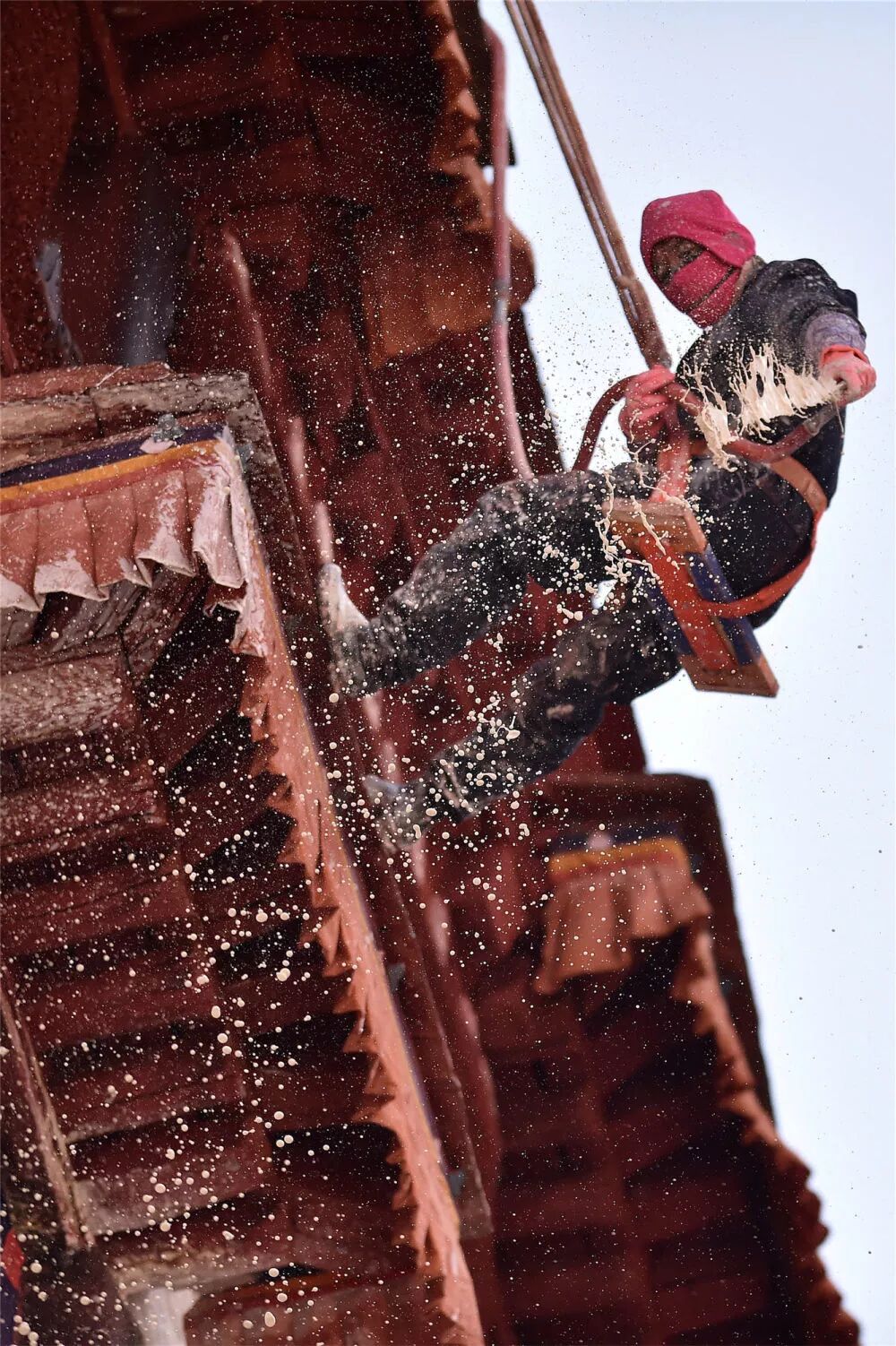 2019年11月1日,在西藏拉萨市布达拉宫,施工人员给墙体喷洒涂料。当日,布达拉宫每年一度的墙体粉刷工程正式启动,这也是布达拉宫例行的“年度美容”。新华社记者觉果摄