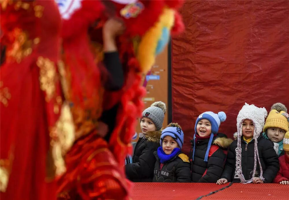 2019年2月19日,小朋友在新疆乌鲁木齐大巴扎步行街观看元宵节舞狮表演。新华社记者王菲摄