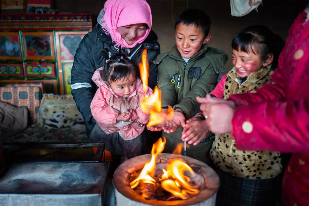 2019年1月17日,西藏班戈县尼玛乡牧民齐美一家在冬季牧民定居点烤火。新华社记者普布扎西摄