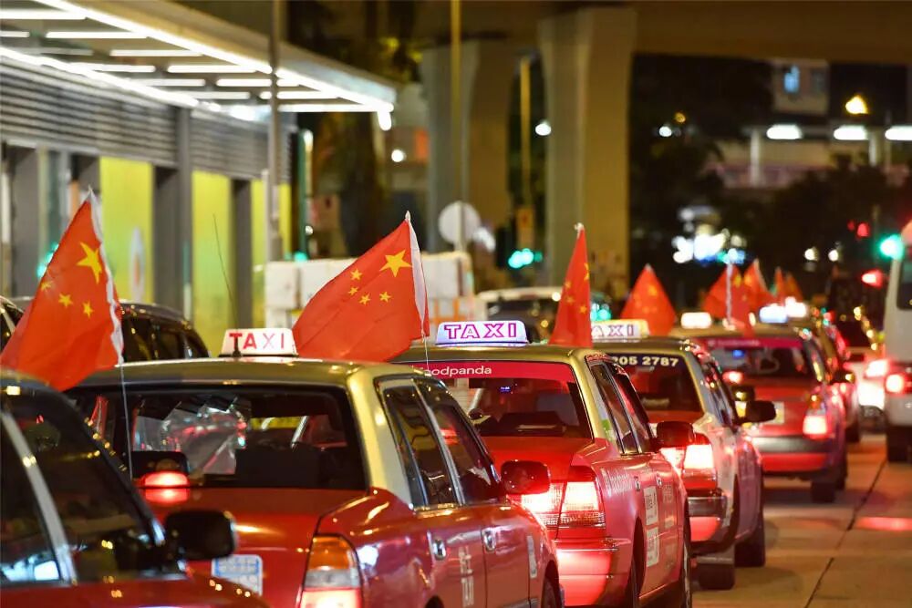 2019年8月23日,从香港港岛筲箕湾出发的张挂中国国旗的出租车行驶在街道上。新华社记者刘大伟摄