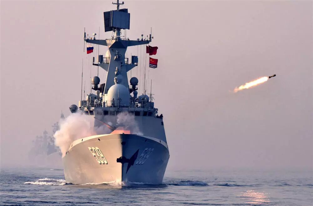 2019年5月3日,中俄“海上联合-2019”军事演习中,一艘中国海军导弹护卫舰在联合反潜课目中实施火箭深弹发射。新华社记者李紫恒摄