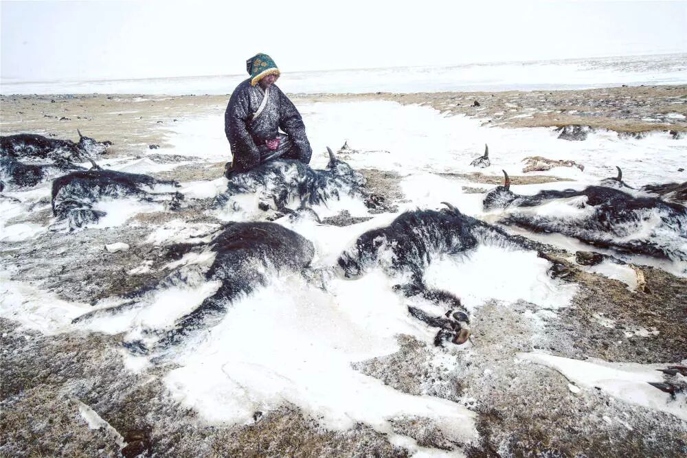2019年2月23日,青海省玉树藏族自治州称多县扎朵镇治多村牧民坐在自家被冻死的牦牛前。2018年12月下旬以来,玉树州境内多次大范围降雪,部分地区遭受重度、特重度雪灾。新华社记者吴刚摄
