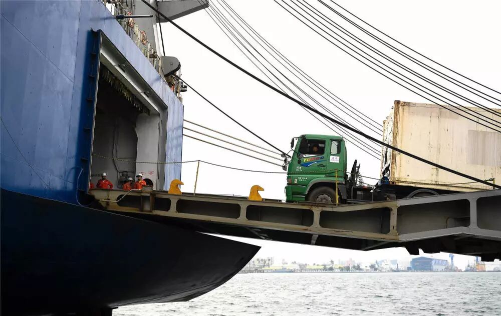 2019年1月19日,台湾高雄至福建平潭海上货运直航首航仪式在高雄举行。这是停靠在高雄港的台湾高雄至福建平潭海上货运直航首航货轮正在装载货物。新华社记者李响摄