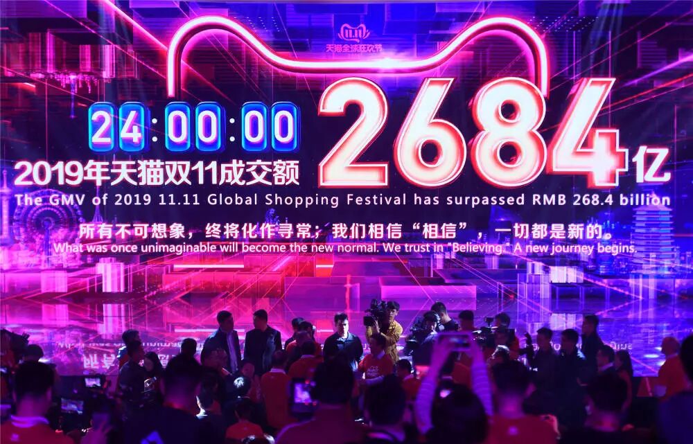 2019年11月12日,在浙江省杭州市阿里巴巴西溪园区媒体中心,大屏幕显示阿里巴巴旗下天猫“双十一”成交额超过2684亿元。新华社记者黄宗治摄
