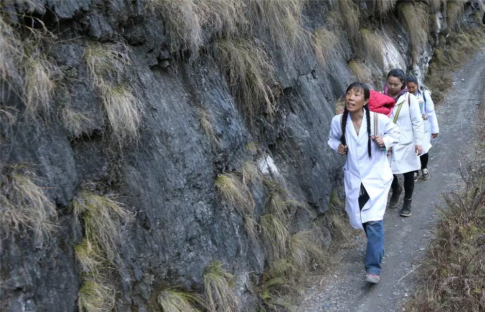 2019年1月13日,在云南省贡山县丙中洛镇,管延萍(左)与同事走在进村的山路上。管延萍从经济发达的珠三角地区,自愿到深度贫困地区云南怒江傈僳族自治州参加东西部扶贫协作,并主动申请将期限从半年延长至3年。新华社记者张加扬摄