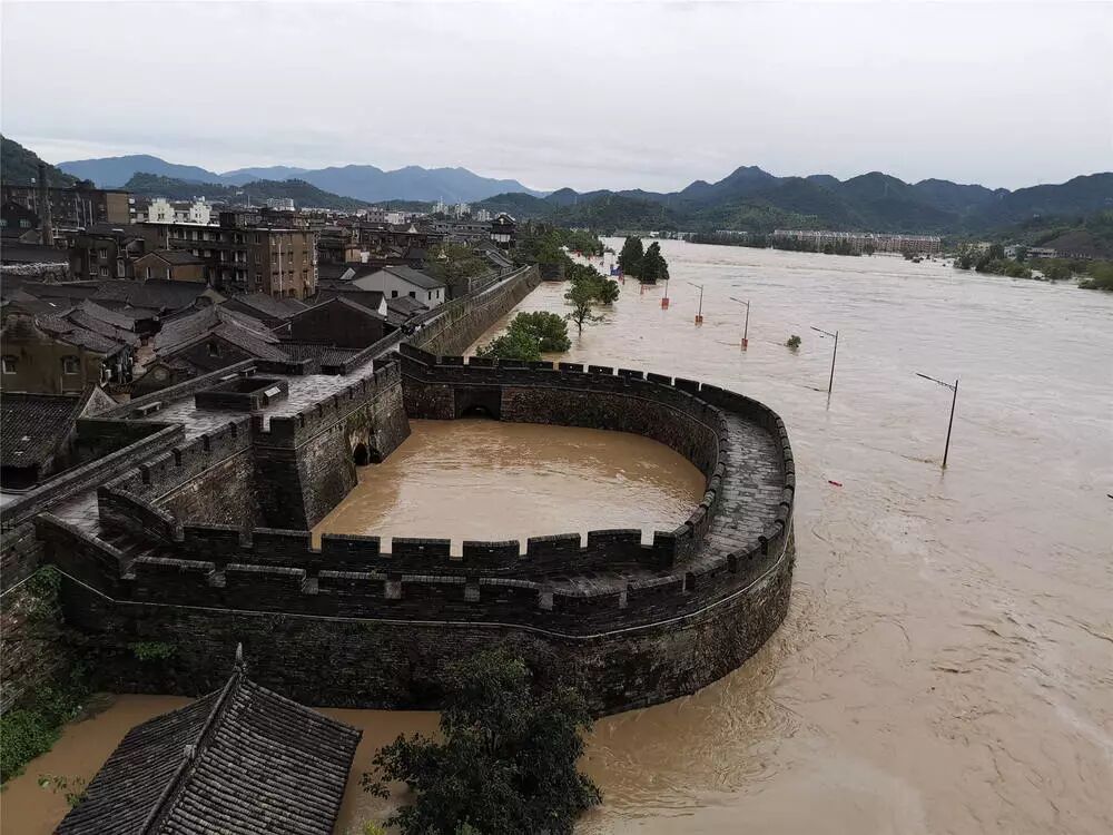 2019年8月,超强台风“利奇马”引发的洪水围困浙江省临海市。这是8月10日拍摄的被洪水围困的临海古城(无人机照片)。新华社发