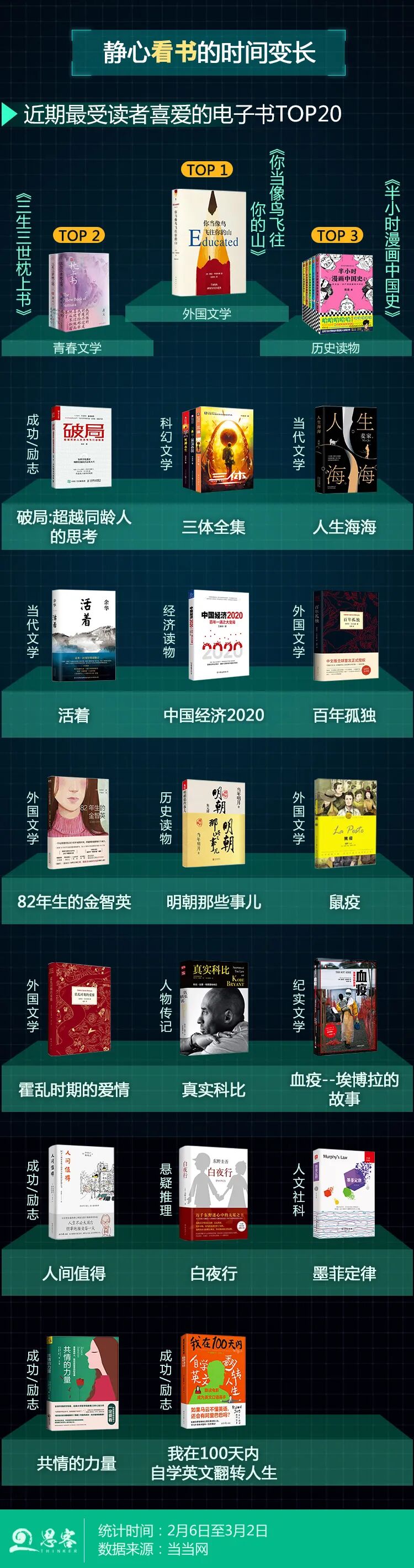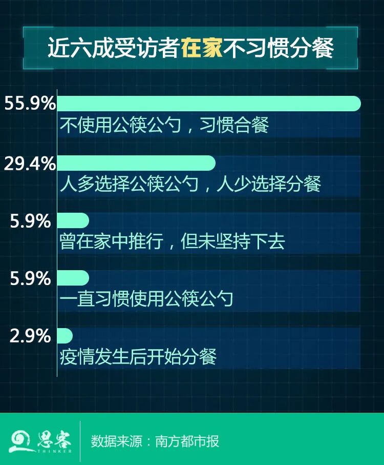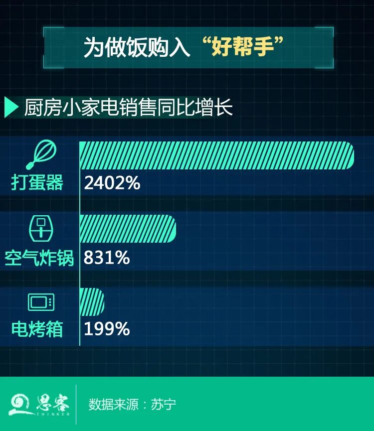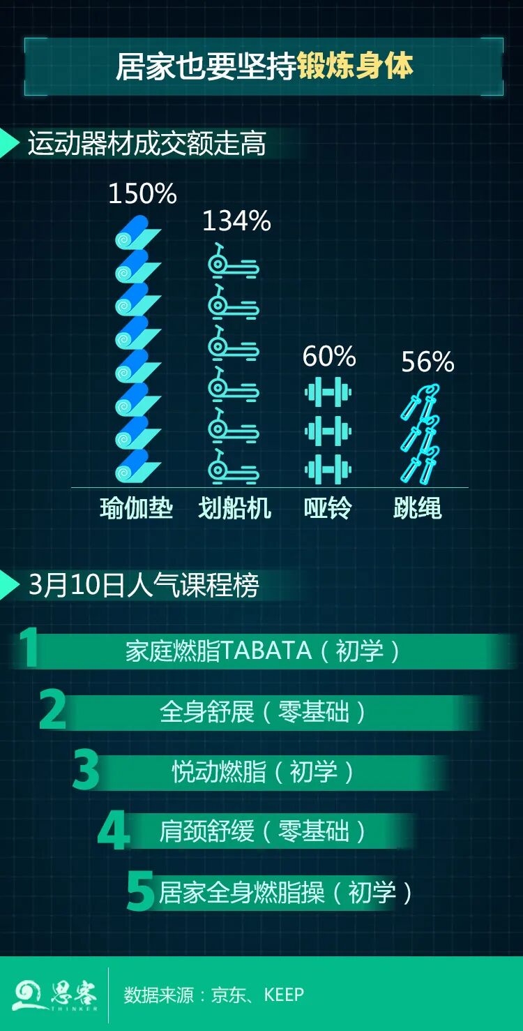 避免聚集性传播,分餐制再度引发关注。共吃一盘菜,这或许是生活中最常见的、毫不起眼的日常,但这样的零距离接触,可能带来传染性疾病的聚集性传播。八成受访者认为推行公筷公勺制、分餐制很有必要。北京、广东等多地提出推行公筷公勺、推广分餐制倡议,获得民众的积极响应。六成受访者表示在家吃饭还不习惯使用公筷公勺或实行分餐。对于传统上倾向于合餐的国人而言,分餐不习惯、显生分、太麻烦,配备公筷公勺或许相对更简单易行。这并不是见外的体现,而是对自己和他人的保护。九成受访者外出就餐会使用公筷公勺或分餐。疫情一定程度上改变了我们传统的夹菜方式,不少餐饮企业已经自发为食客配备公筷公勺,防范“病从口入”。进门先洗手成“自觉动作”。“接触”是很多病毒的主要传播方式,保持手部卫生很关键。深圳市一项调查报告显示,受疫情影响,98.06%的市民在外出后回到家或饭前便后有立即洗手的习惯,洗手行为养成率较高。不仅勤洗手,还要会洗手。微博上“七步洗手法”的话题阅读量超千万,网民表示每次吃饭前都要按照“七步洗手法”认认真真洗手,还会在洗手的同时唱完两遍生日歌。在家开火做饭成生活常态。厨艺的不断精进,不仅让宅家生活有了质量,还能保证复工之后有能量。大数据显示,下厨房APP的热度从一月末开始到二月中迎来一波大爆发。厨艺不好也没关系,依靠电烤箱、空气炸锅、多功能电饭煲等厨房小家电,成为家里“行政总厨”也不是难事。凉皮、蛋糕、奶茶……不能出门也要满足自己的味蕾。相关数据显示,烘焙类商品的搜索量增长了100倍,并带动酵母/酒曲商品销量增长近40倍,饺子皮销量增长了7倍多。“自制蓬松酥脆大油条”是网民在下厨房中做过最多的美食;“电饭锅蛋糕”因其简单好做而成为短视频平台的宠儿,播放量超10亿。回归健康生活方式,拉近与家人的距离。在这段与家人相聚的时光里,一起锻炼、一起读书、一起游戏,家庭氛围越来越好。中国青年报调查显示,71.9%的青年近期会培养更多和父母的共同爱好。亲子居家健身,爱与健康同在。不少健身类App为了让那些宅在家里要带娃的家庭尽情享受亲子时光,推出了亲子健身教学,让很多家长在陪伴孩子增强体质的同时,可以和孩子们像朋友一样相处。简便易行的居家健身方法得以推广,瑜伽、平板支撑、举哑铃等占用场地小的运动受到广泛欢迎。短视频平台上,“宅家也爱做运动”“客厅健身房”“居家健身小妙招”等话题,累计播放次数约30亿。各类热门的“初学”“零基础”课程让运动“小白”能够在家科学健身。受此影响,健身板、瑜伽垫、哑铃、体感游戏手柄等小型健身配套商品热销。以“读”攻毒,越来越多的人重拾书本,汲取知识的力量。宅家期间,碎片时间被整合,大家有更多的时间投入到高质量阅读。在知乎热门话题“因为疫情待在家中的你们每天都在干什么?”中,有超六成回答称“看书”。大数据显示,2月底微信读书日活用户376万人,他们每日使用时长约70分钟,一天能阅读约2万字。其中医疗、疫情相关作品备受关注,《新型冠状病毒感染防护》《鼠疫》《血疫:埃博拉的故事》等图书搜索次数名列前茅。前一阵在方舱医院读书的“清流哥”手里捧着的那本《政治秩序的起源:从前人类时代到法国革命》走红网络,成为当时豆瓣读书榜的第一名。不少书友纷纷找来这本书,一起阅读。阅读为正处于恐惧紧张情绪的人们点亮“精神灯塔”。