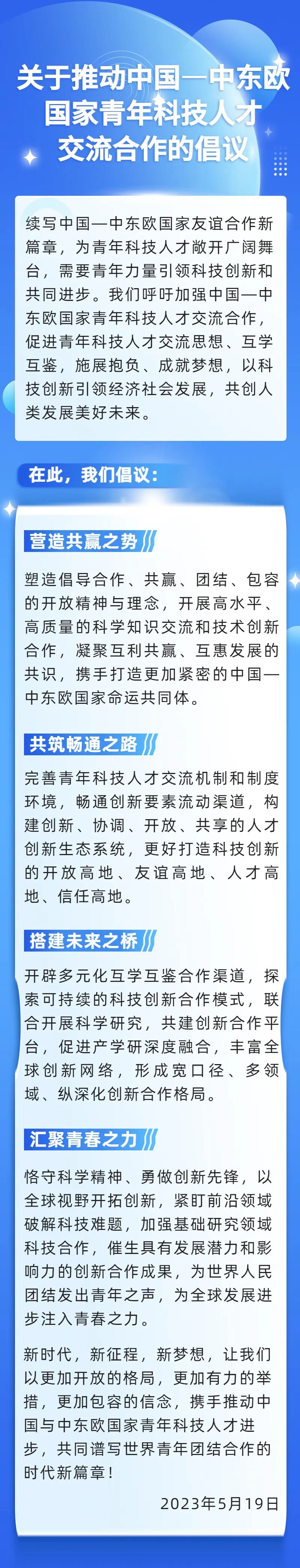 在5月19日举办的第二届中国—中东欧国家青年科技人才论坛现场,来自贝尔格莱德大学的博士生elena Vukalovic和中科院宁波材料所的高级研究员周小兵代表中国—中东欧国家青年科技人才向全社会发出倡议,呼吁进一步推动中国—中东欧国家青年科技人才交流合作,加强对话、协同行动、共促发展,开辟中国与中东欧国家合作发展互利共赢新局面,不断铸就面向未来发展的新动能。
