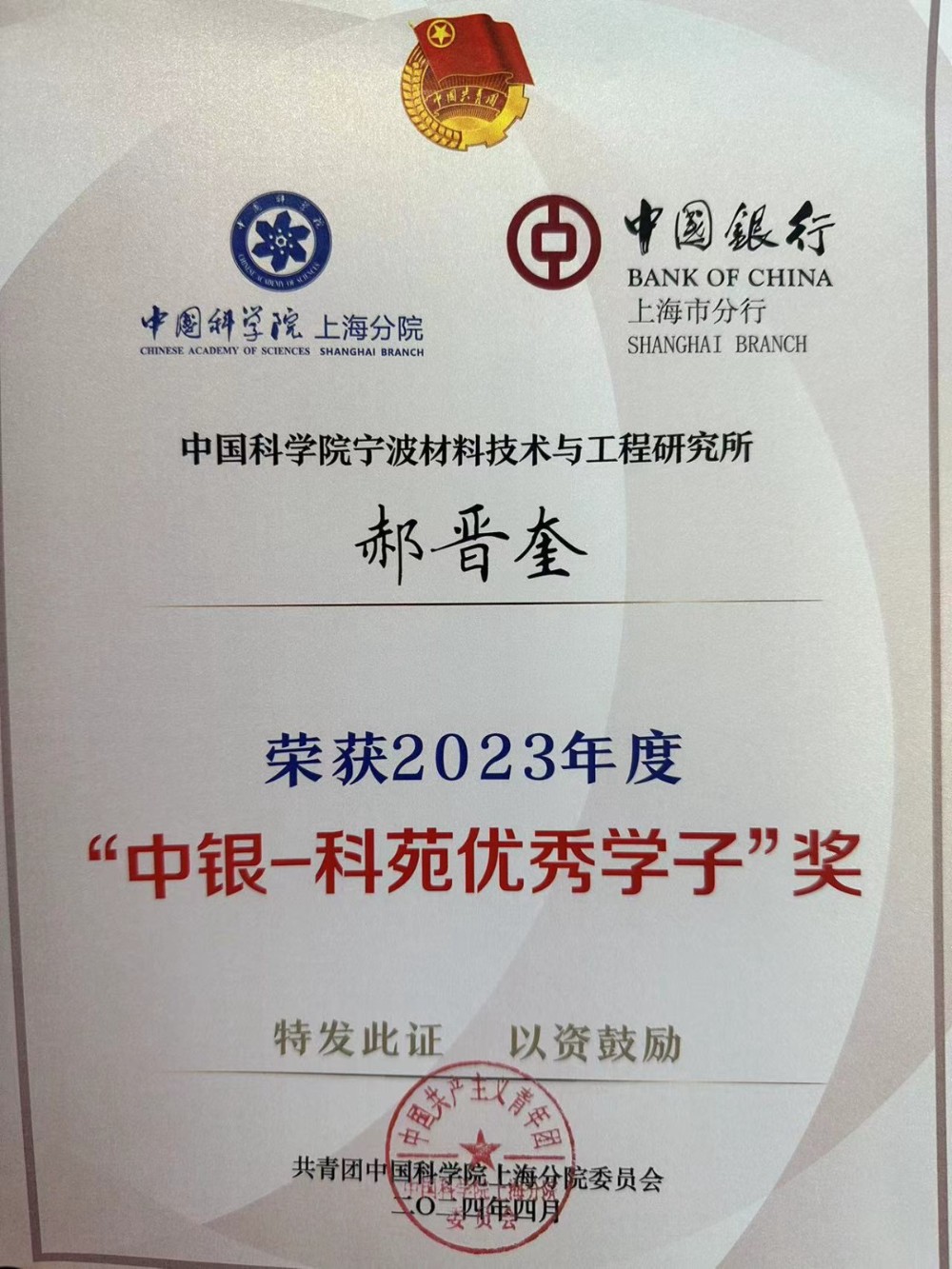近期,中国科学院上海分院团委公布了2023年度“中银-科苑优秀学子”的获奖者名单,恭喜我团队郝晋奎博士荣获该荣誉。“中银-科苑优秀学子”奖是中国科学院上海分院团委设立的未来人才支持计划,旨在激发研究生作为“国家队”“国家人”,心系“国家事”、肩扛“国家责”的使命担当,弘扬老一辈科学家“国之大者“情怀,鼓励研究生积极参与到国家重大任务中,为高水平科技自立自强培养优秀后备力量,中国科学院上海分院团委设立未来人才支持计划,以表彰、鼓励在科技攻关方面发挥攻坚克难精神,品学兼优、专心致研的优秀学生。