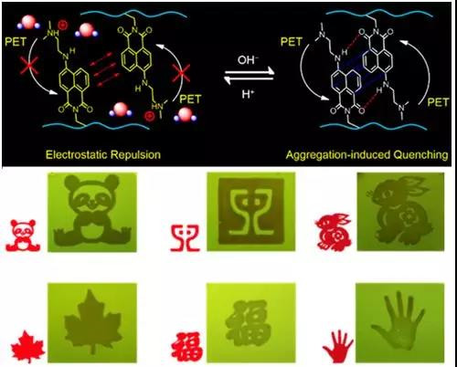 基于萘酰亚胺荧光基团的pH响应性,科研人员还构建了一种刺激响应性的高分子水凝胶复合材料(如图4所示)。该材料不仅可以用于水环境pH的检测,还可以通过离子印染的方法,实现了水凝胶表面荧光强度的时空调控。