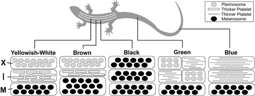 图2. 产生五种不同皮肤颜色的变色龙表皮色素细胞的垂直组合和相对厚度(图片来自Zoolog. Sci. 2006, 23, 793-799)