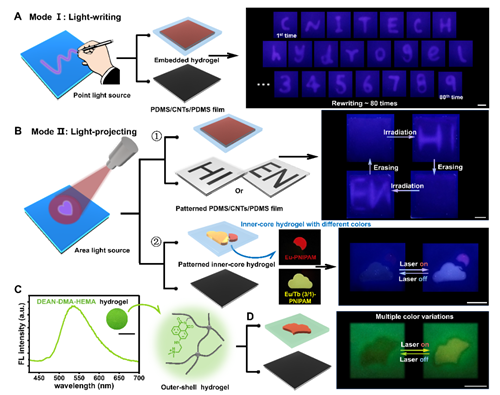 图4. 可书写水凝胶显示体系的“光触发-热量产生-荧光输出”的级联过程