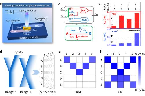 光控忆阻器结构示意图(a),可重构逻辑操作(b,c),以及图像处理功能(d,e,f)