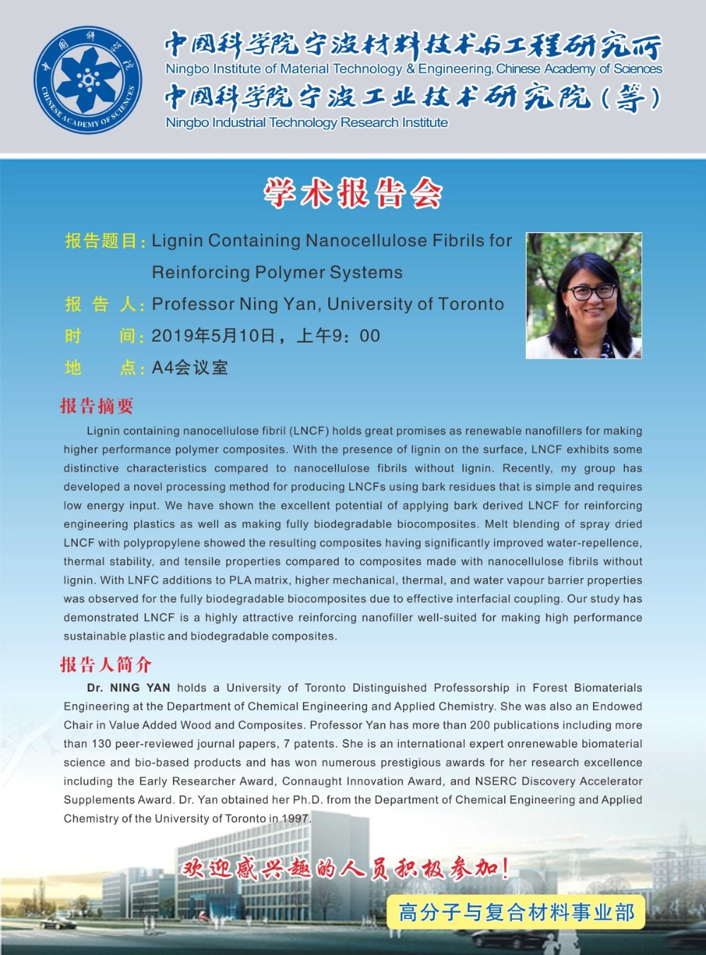 2019.5.10,Professor Ning Yan:Lignin Containing Nanocellulose Fibrils for Reinforcing Polymer Systems