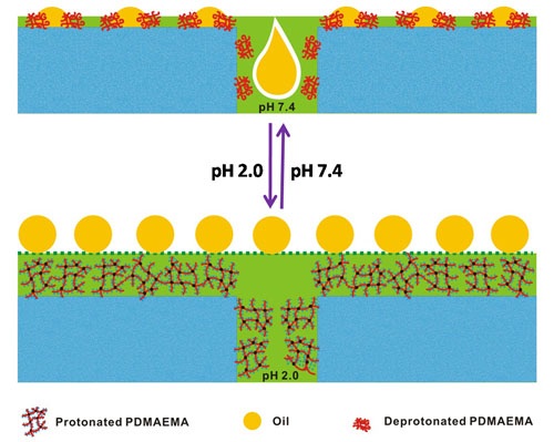 科研人员还以N,N-二甲氨基乙酯为功能单体制备了pH响应PVDF膜。该分离膜的浸润性可以通过介质的pH得以调控,从而发生水下超亲油(pH=7.4)向水下超疏油(pH=2.0)的转变,成功分离水包油乳液,进一步拓宽了该分离膜的应用领域。此项研究发表在RSC Advances, 5 (2015) 23530 – 23539。