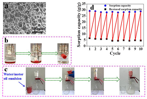 图2.(a)泡沫形貌,(b)吸油性能,(c)油水乳液分离,(d)反复吸油性能
